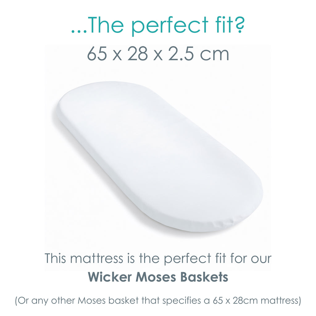 Add a 2-pack of Moses Basket Sheets and/or a Mattress Protector to your order and save with our bundle offer. Sheets and mattress protectors are universal and designed to fit both Wicker Moses Basket mattresses (65 x 28 cm) and Palm Moses Basket mattresses (74 x 28 cm). Packaging may display the larger size but they are suitable for both.