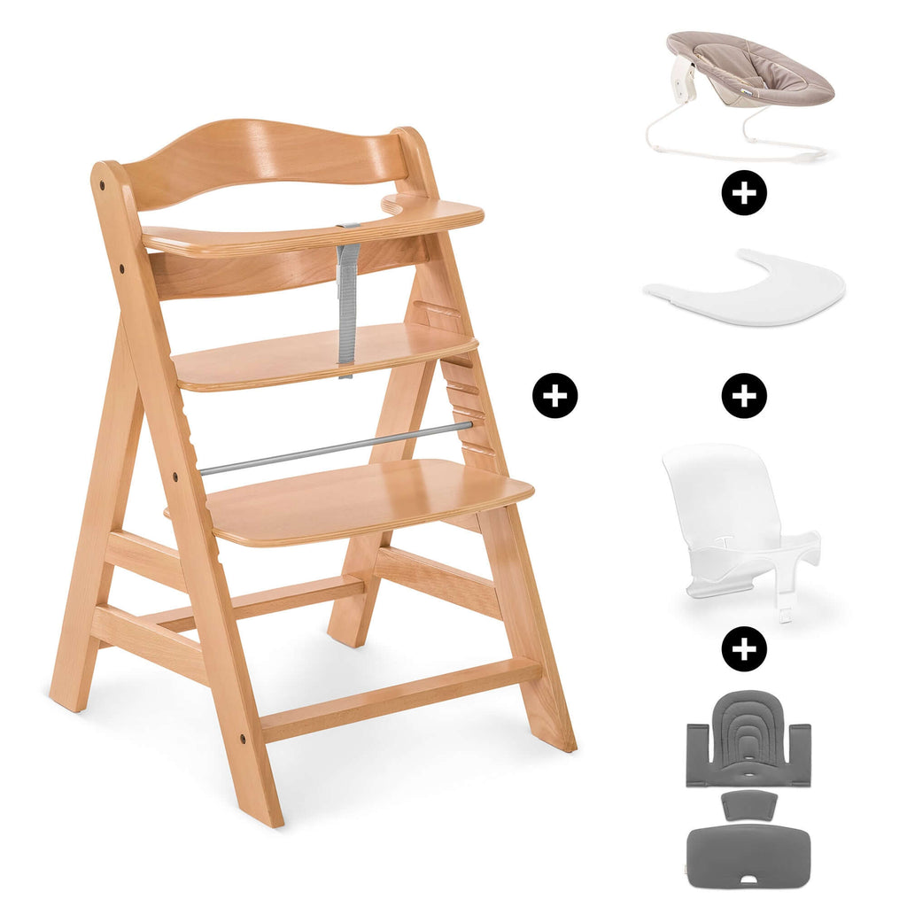 Everything you need for comfortable, supported seating from newborn through toddler years and beyond, the Hauck Alpha+ Wooden Highchair Bundle is a complete, grow-with-your-child mealtime and family seating solution. Thoughtfully designed to support your little one from day one, this bundle combines Hauck’s iconic Alpha+ wooden highchair with the versatile Highchair Bouncer Eco, padded seat cushions, and a practical wipe-clean tray — giving parents convenience, comfort, and long-term value in one beautifully coordinated set.