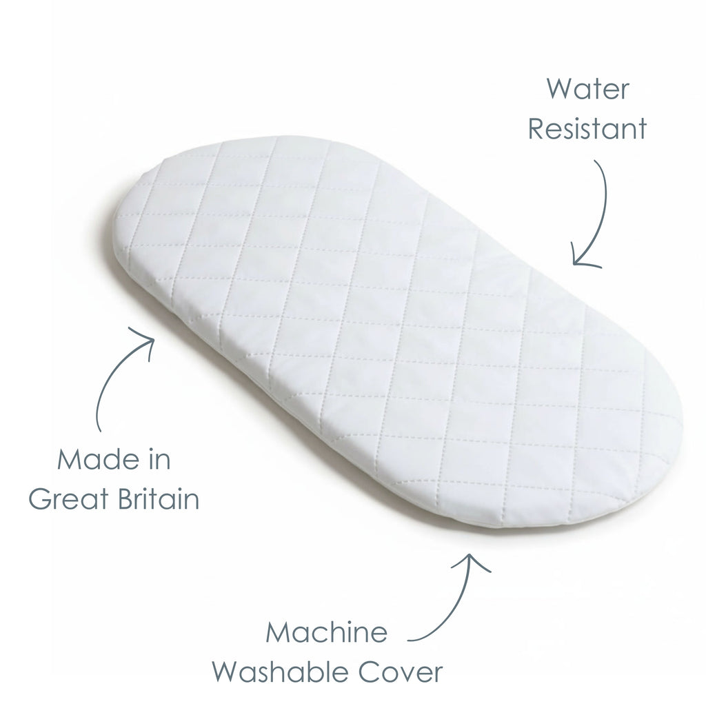 Beautifully made in Great Britain, this Quilted Moses Basket Mattress combines comfort, safety, and sustainability - helping your newborn sleep soundly, night after night.