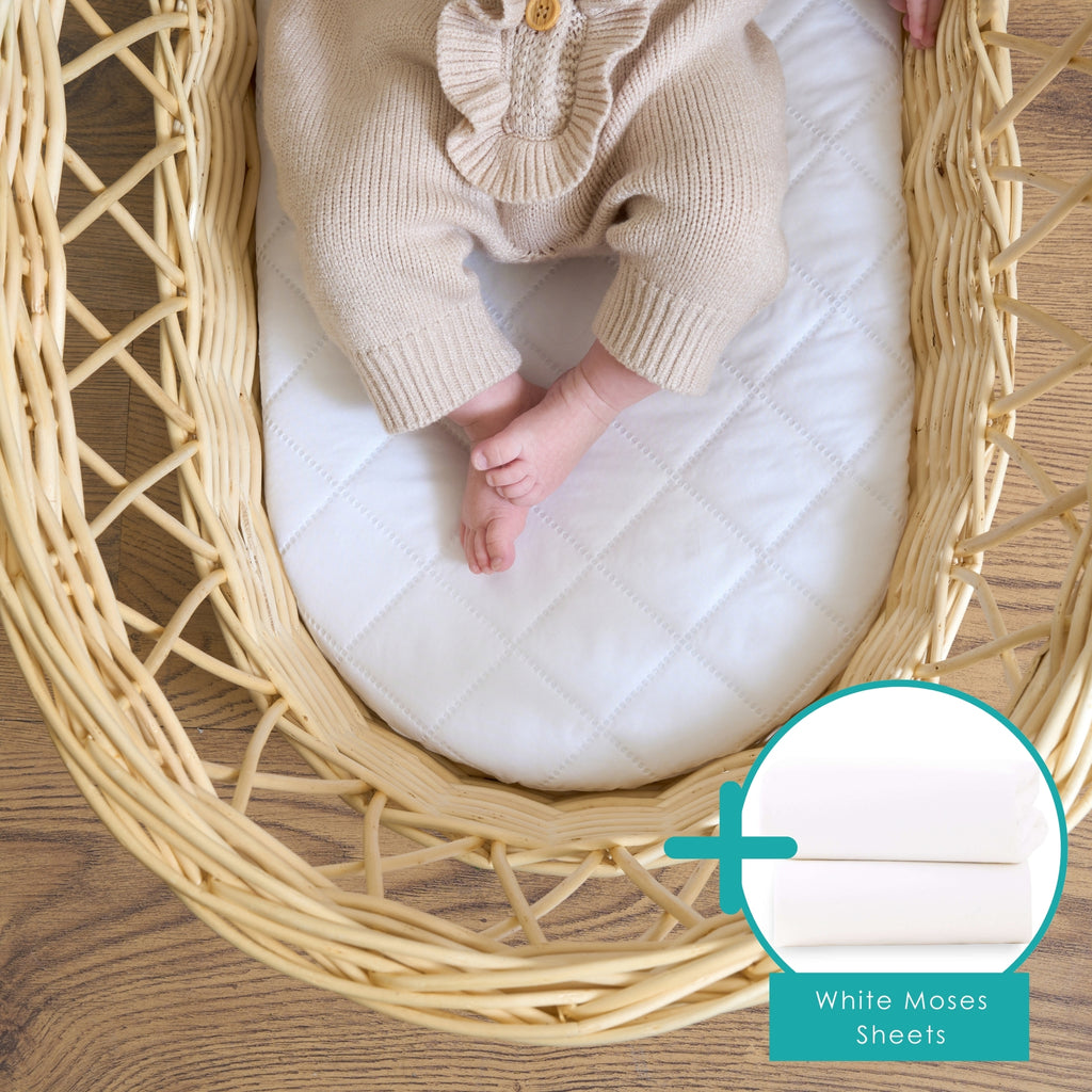 Save When You Bundle: Make life easier (and comfier!) by adding a 2-pack of Moses Sheets or a Protector to your order. They’re universal – made to fit both our Wicker and Palm Moses Baskets, even if the packaging shows a slightly larger size.